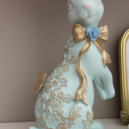This blue Easter spring bunny figurine features intricate butterfly details and a decorative gold bow. Designed to enhance seasonal decor, its vibrant color and elegant accents can complement a variety of settings, making it a sophisticated choice for springtime celebrations.